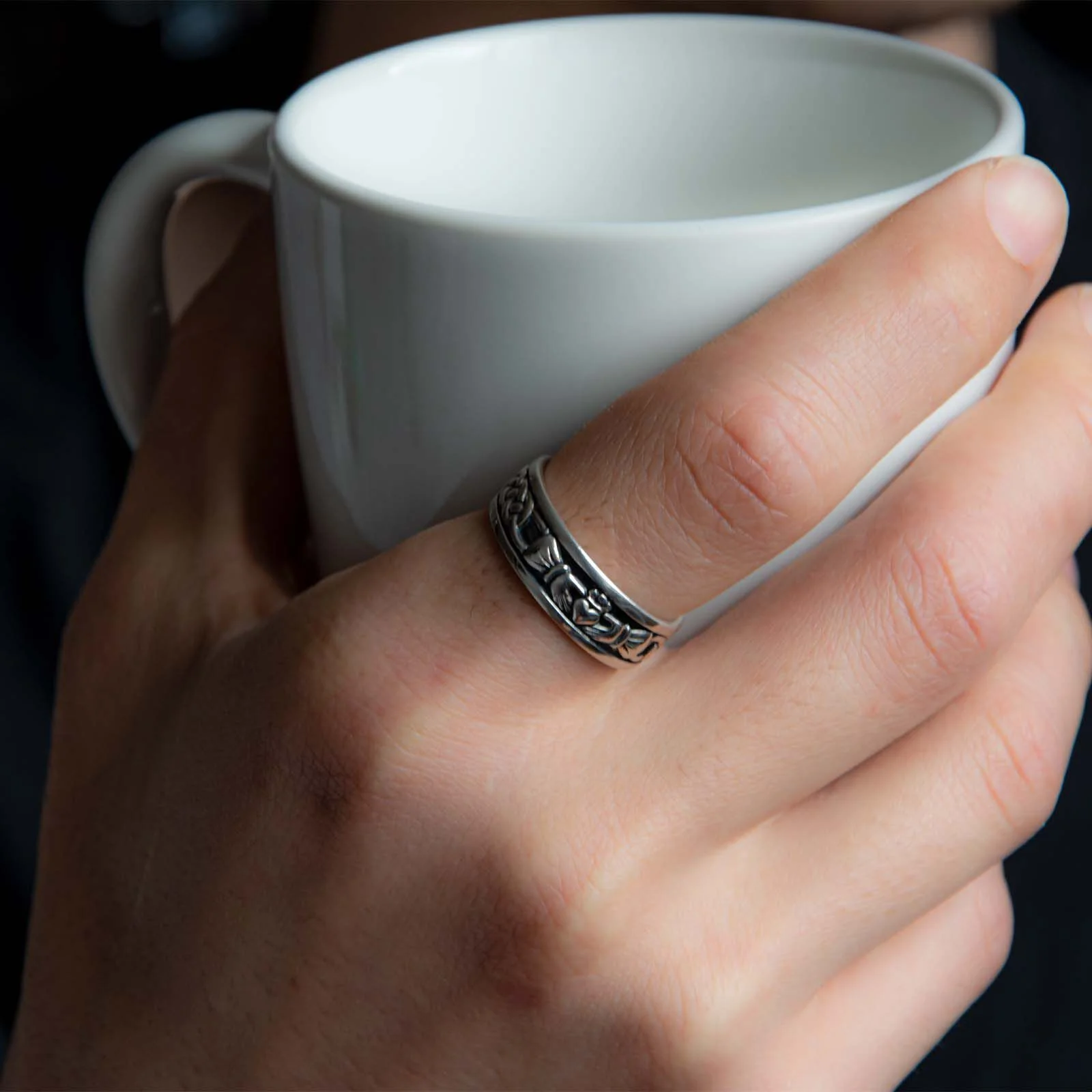 Crafted from solid 925 hallmarked sterling silver, this men's Claddagh ring features a rugged oxidised finish, adding depth and contrast to its intricate detailing. The traditional Irish design two hands cradling a heart beneath a crown speaks to enduring connection and steadfast values.