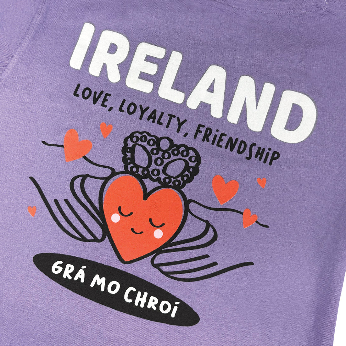The Grá Mo Chroí T-Shirt is a vibrant lilac short-sleeved tee featuring an orange heart with a blue bow, and the phrase is an Irish expression meaning "Love of My Heart." Made from soft, breathable fabric, it's a perfect and comfortable choice for summer wear.