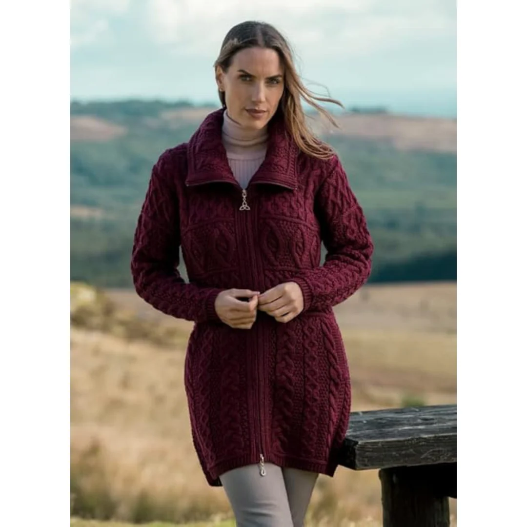 Wrap yourself in warmth and heritage with the Aran Crafts Wine Double Collar Sweater Coat, made from 100% natural Merino wool. Featuring intricate Aran stitching, a cozy double collar, and a unique Celtic knit zipper, it blends timeless Irish tradition with modern elegance.