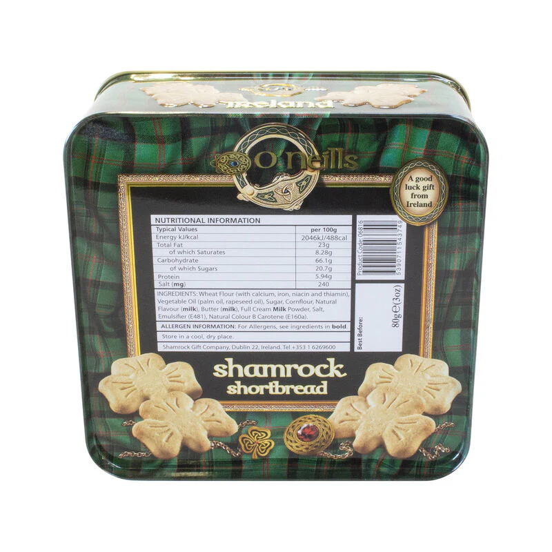 The name O'Neill comes from a noble Gaelic lineage rich in history. This shortbread blends high-quality, simple ingredients with a buttery flavor, and its shape makes it a charming gift, perfect for any occasion. Please note, these cookies have a European expiration date, with the day appearing first, followed by the month and year.